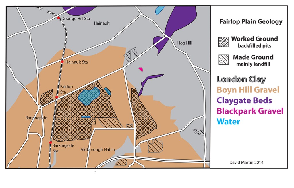 The second (476,000 to 435,000 years ago), was the biggest with the ice sheet pushing south from the Lake District to the River Thames. As it moved south, it carried with it soil and rocks over which it passed, When it melted it deposited this debris as boulder clay. The boulder clay ends at the top end of Fencepiece Road by the former Bald Hind PH- the Lambourne End Ridge. The deposits on its southern edge were eroded away by the Thames.